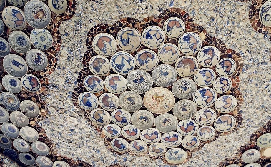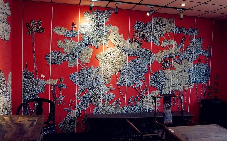 豪宅設(shè)計(jì)分享房子里有不少這樣用瓷片拼成的名畫。此畫為張大千名畫,用元明清三代青花瓷拼成,據(jù)稱紅色的瓷片燒制技術(shù)現(xiàn)已經(jīng)失傳。